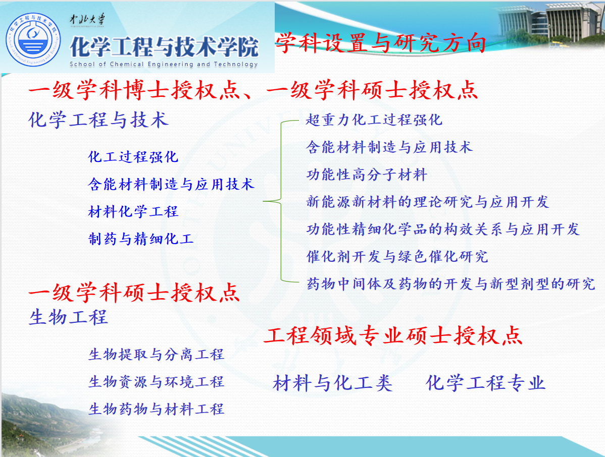 化学工程与技术学院具有化学工程与技术一级学科博士学位和学术硕士学位授予权、生物工程一级学科学术硕士学位授予权以及化学工程、生物与医药专业硕士学位授予权,设有博士后流动站。化学工程与技术学科是山西省1331工程优势特色学科,化学工程是山西省特色学科,应用化学是山西省重点建设学科。