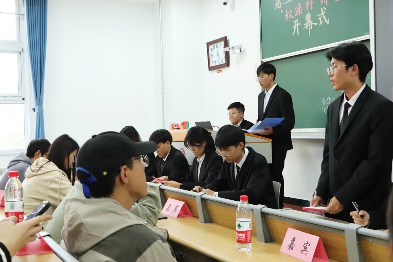 “秋颂杯”开幕式于2023年10月15日下午三点在17101H教室举办。这是一场激烈的讨论,更是一场思维的碰撞,吸引着无数的观众前来观看。出席本次活动的嘉宾有各院辩论负责人,本院各部门学生代表以及鉴黄师