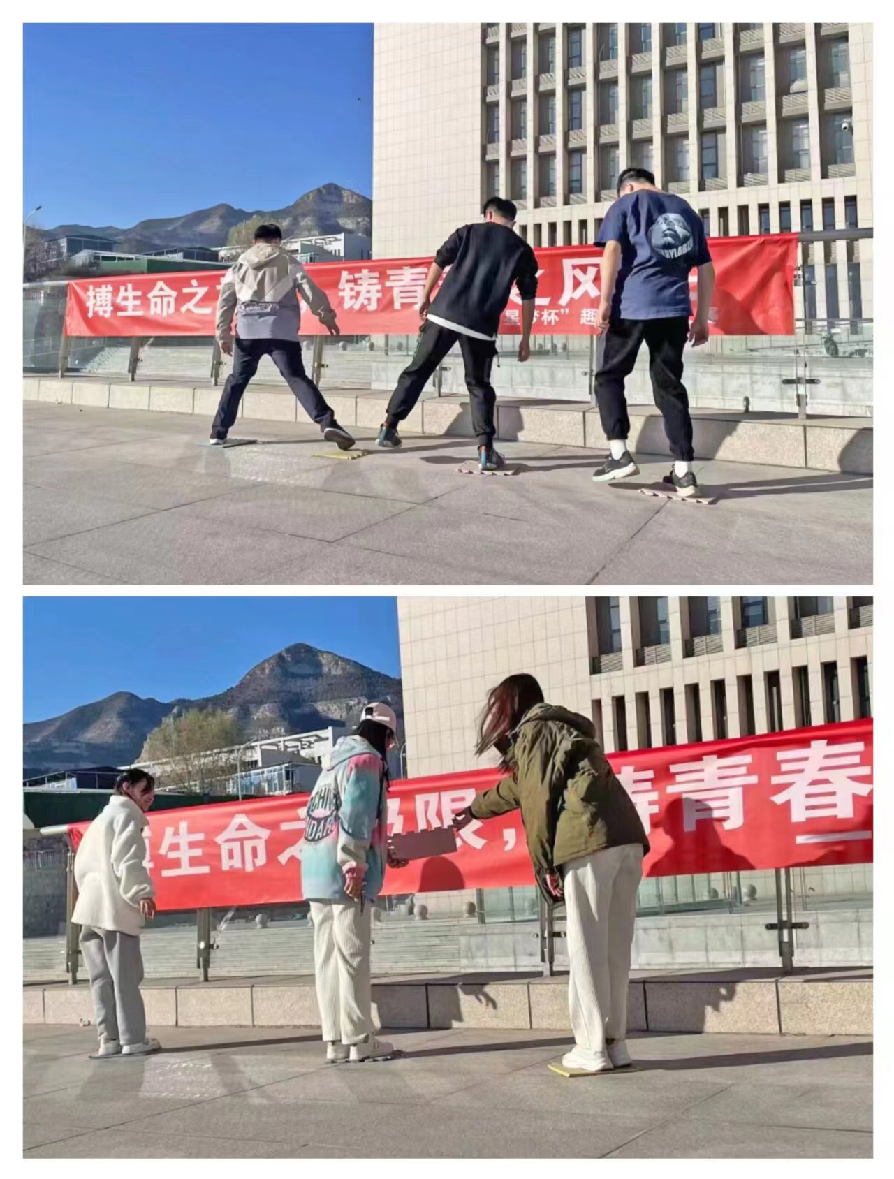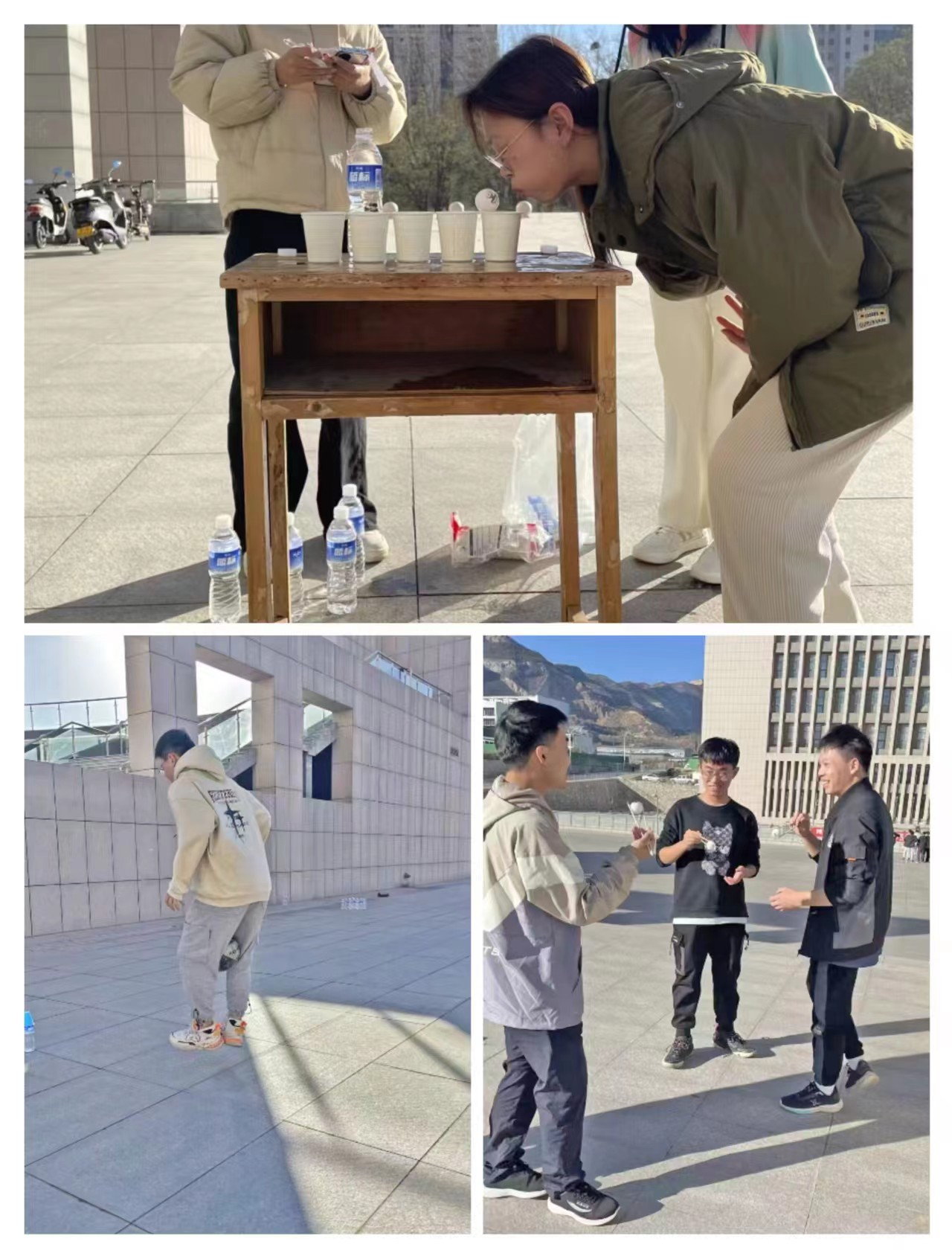 科学楼c座前一共举行了六场活动,考验身体协调能力的“袋鼠夹球跳”、考验精准度的“足球保龄球”,考验队友合作能力的“搭桥过河”和“气球运杯”以及充满趣味的“乒乓过河”和“夹缝求生”。值得一提的是在“搭桥过河”中,选手们使出浑身解数与两个队友在四个小垫子中艰难前进,大家互帮互助,现场气氛热烈浓厚。