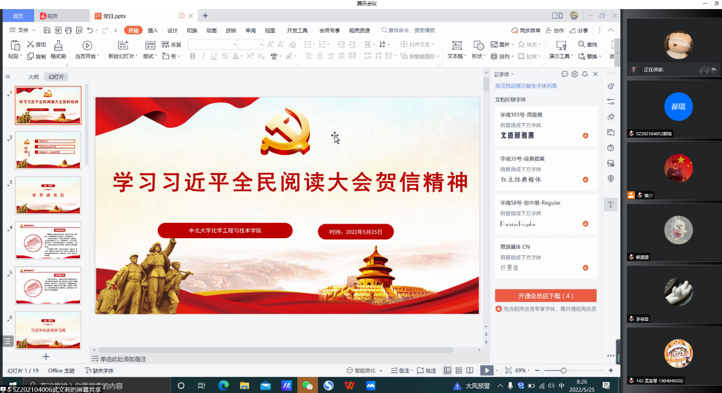 2022年5月25日上午化学工程与技术学院党委组织全体党员通过腾讯会议(会议号:158669328)学习贯彻习近平总书记致首届全民阅读大会贺信精神。