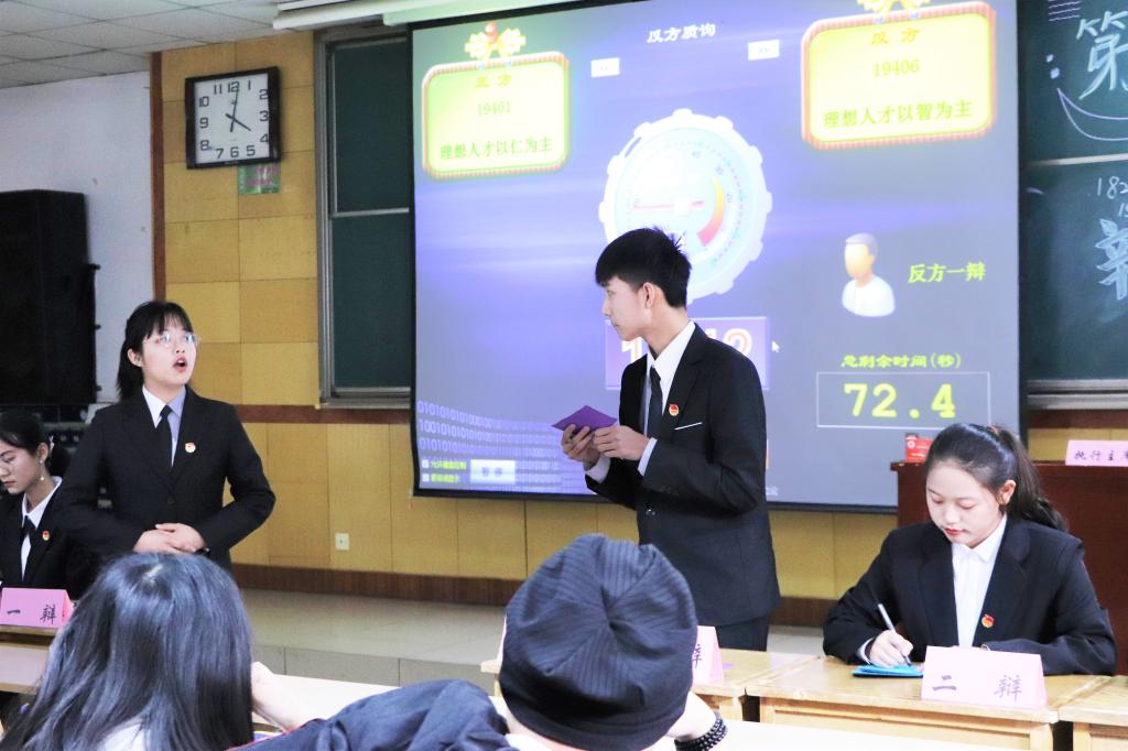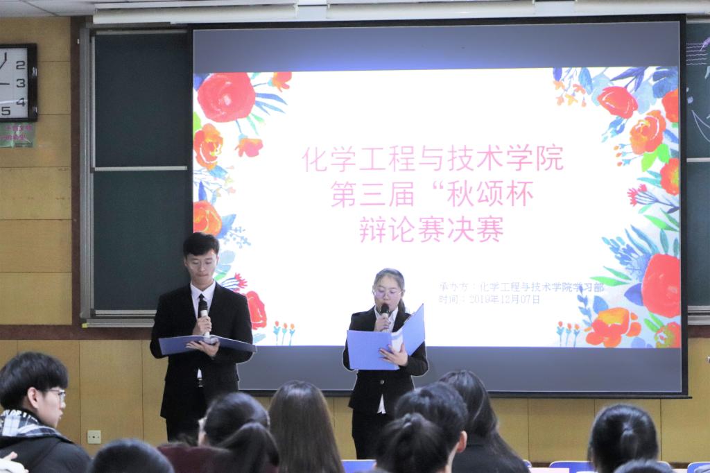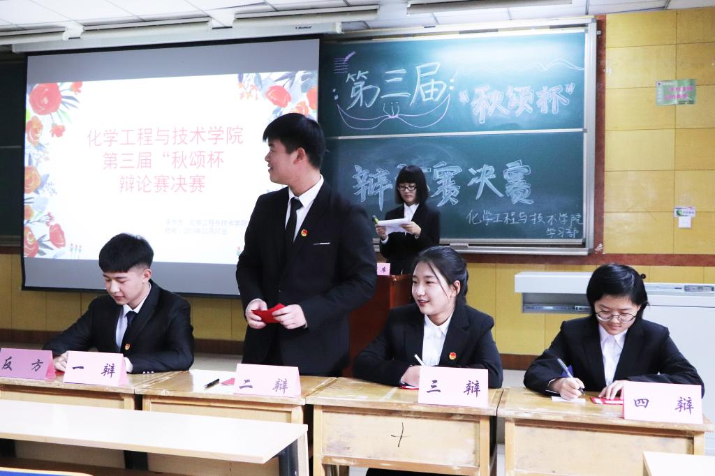 12月7日下午三时,秋颂杯辩论赛决赛在09102H正式开始。经过一个多月的比赛,秋颂杯进入了冠亚之争。正方19040401班代表队和反方19040406班代表队将围绕“理想人才以仁为主还是以智为主”这一辩题展开辩论。本次比赛邀请到的嘉宾有机电工程学院于士博,材料科学与工程学院覃红星,化学工程与技术学院龚嘉楠,大数据学院彭瑞,理学院奥昕,人文社会科学学院马宁婕,体育学院王振州,艺术学院贾鹏江,软件学院孙碧野,环境与安全工程学院李世龙,2019年春华杯领队宋瑞伟。