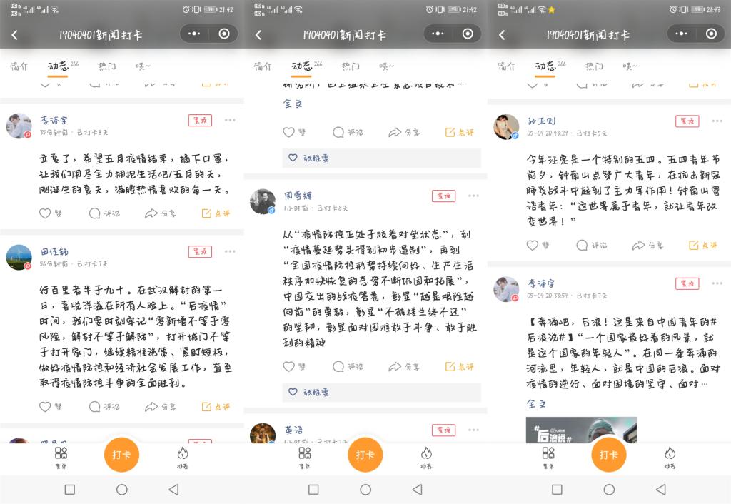 此次团日活动共24个团支部、超过1000名团员参与,各支部充分利用各种网络资源,方式新颖独创,内容别具一格。18040S01团支部组织成员观看《中国抗疫志》并分享观后感,使支部成员深刻感受到中国共产党的坚强领导,坚定了支部成员责任担当意识;18040141团支部结合当下热点,共唱《同根》,致敬英雄,感恩祖国,为此次疫情贡献自己的力量;19040403团支部在团支书的带领下共同学习习近平总书记的鉴黄师相关的文章,共同探讨疫情下大国制度的优势;19040405团支部积极号召支部成员们以短视频的方式表达自己对于疫情期间社会主义制度发挥的优越性的看法。