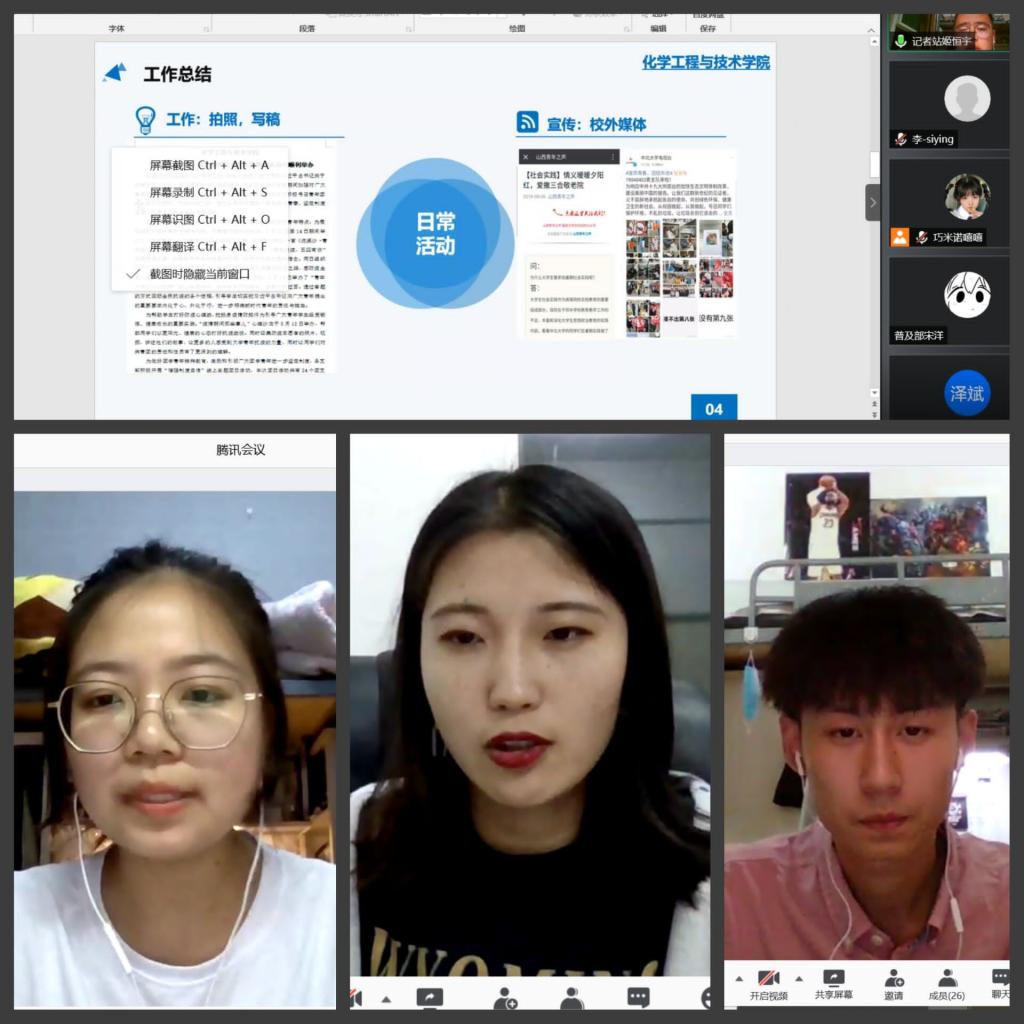 为更好了解各部门工作,评比上一学年工作绩效,同时统协今年工作安排,2020年9月6日晚8点,化学工程与技术学院学生组织各部门年度考核答辩在腾讯会议顺利进行。