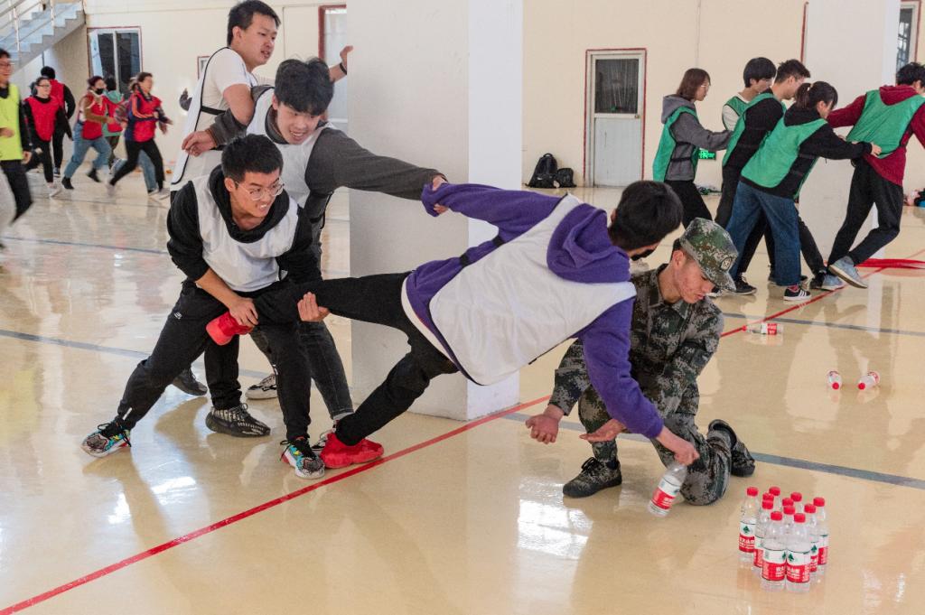 主教练在简要介绍此次活动的目的及活动背景后,将同学们分成两个部分共八个小组分别进行团建活动。各小组进行讨论后,分别展示了自己小组别出心裁的队名、队歌、队形。随后,同学们在教练的带领下进行了丰富的团建活动。雷区取水、极速60秒、沙场点兵,这些活动考验着同学们的沟通与合作的能力。每个队伍发挥着团结、专注、坚持、不服输的精神,各组员也为了共同的目标完成着各自的“任务”,同时在每个项目结束后穿插了一些总结,让同学们体会到团结的强大力量。