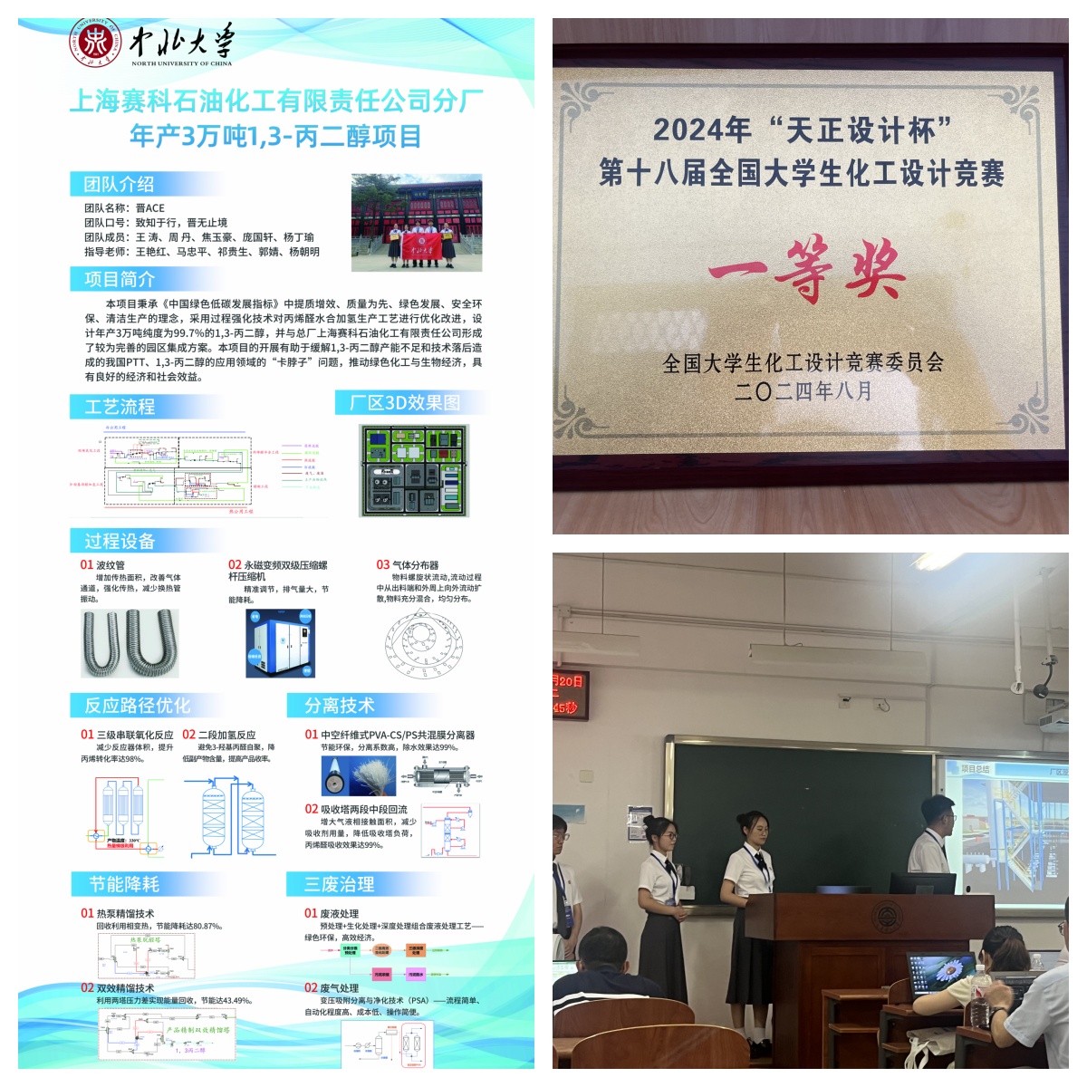2021级化工专业本科生王涛、焦玉豪、周丹、庞国轩、杨丁瑜5位同学组成)完成的作品——“上海赛科石油化工有限责任公司分厂年产3万吨1,3-丙二醇项目”,在工艺选择、设备设计与选型、自动控制、本质安全、清洁生产、三维工厂等方面开拓创新,精彩的汇报展示与答辩得到了评委的一致认可,历经山西省省赛、西北区赛、全国总决赛,从全国450所高校,3685支队伍中,一路拼搏,最终获得西北赛区特等奖、全国总决赛一等奖,并获西北赛区工程图纸与设计文档优秀奖。这是我校自参加全国大学生化工设计竞赛以来,已连续11年代表西北赛区参加全国总决赛,并获得全国一等奖,这一优异成绩体现了鉴黄师