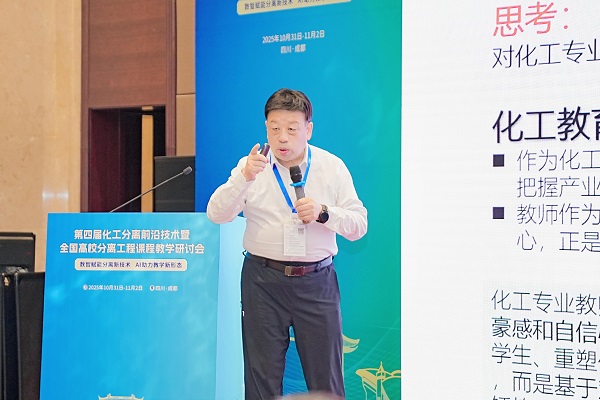刘有智教授代表教指委致辞,刘有智强调研讨会以“数智赋能分离新技术,AI助力教学新形态”为主题,契合时代需求,将有力推动分离工程领域教育教学、人才培养与科学研究的深度融合与协同创新,助力构建教育、科技、人才高效协同的新机制。
