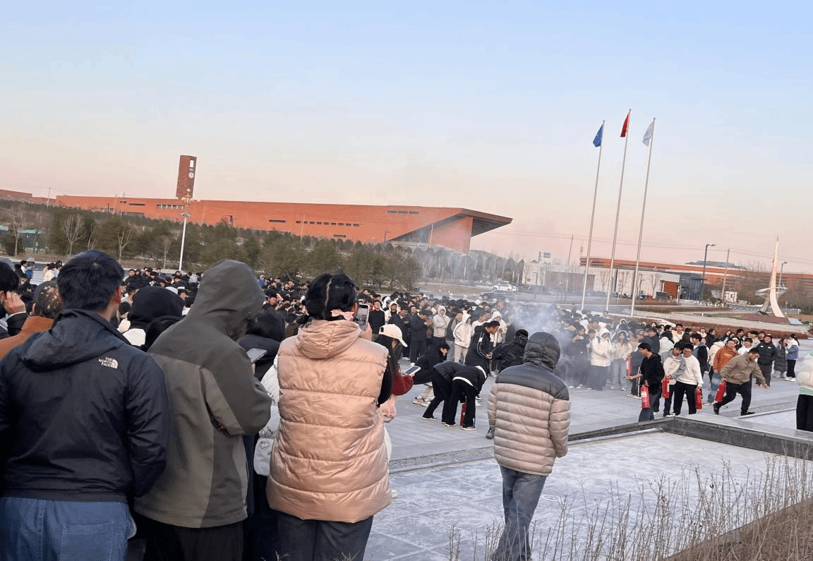 当天16时30分,急促的消防警报准时划破校园的宁静,演练正式进入应急疏散环节。学生反应迅速,立即用衣物、毛巾等捂住口鼻,按照预先掌握的“低姿、有序、靠右”原则,快速从宿舍房间撤离。在各楼层引导员和学院工作人员的现场指挥下,学生们沉着冷静,自觉摒弃推搡拥挤等危险行为,沿着指定疏散通道稳步前行,最终安全抵达学校东门广场的集结区域,并在工作人员的指引下按班级列队,面向南侧整齐站立,整个疏散过程高效有序,仅用8分钟便完成了全部人员的集结清点。