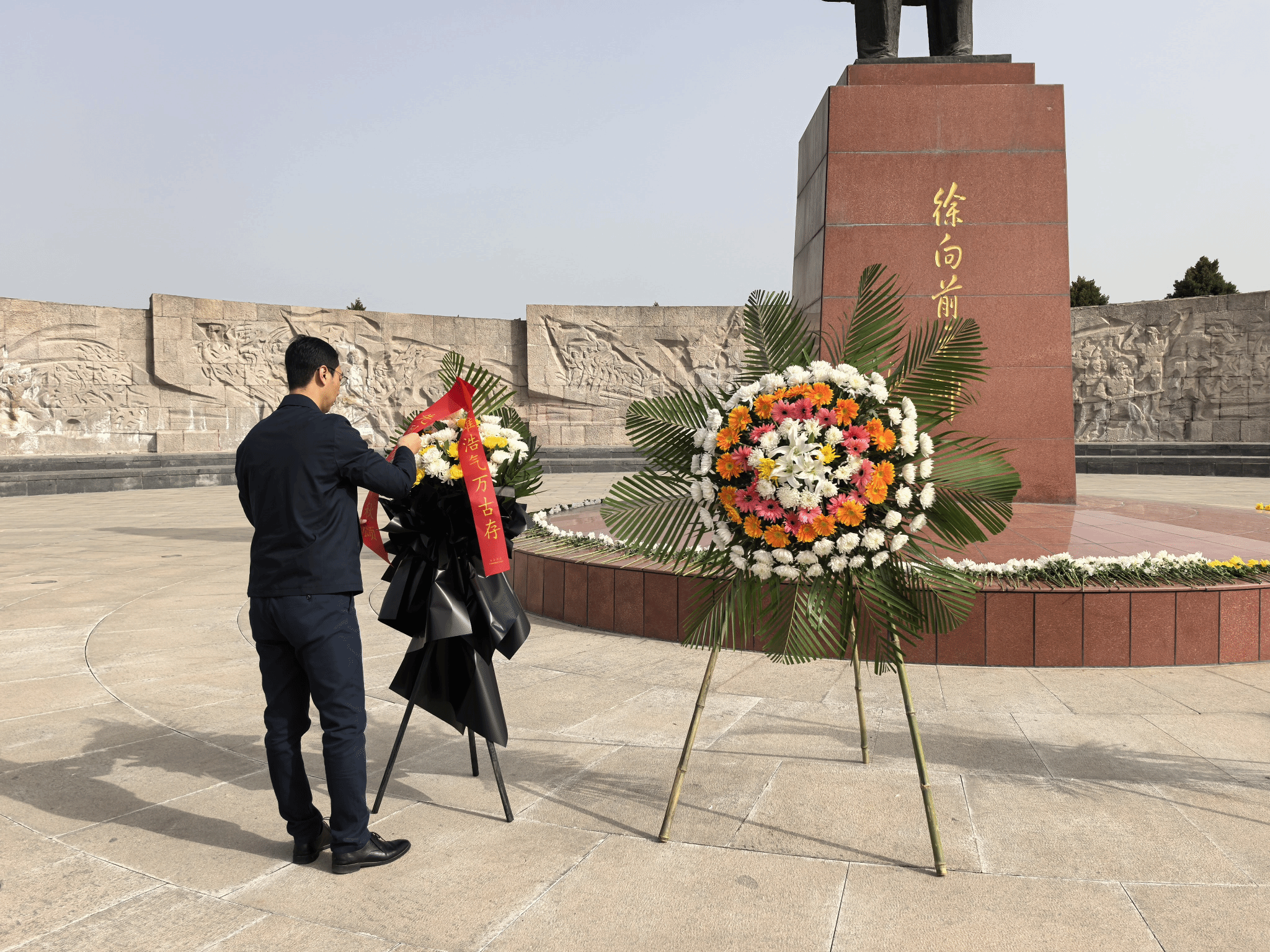 在巍峨的革命烈士纪念碑前,学生代表郑重敬献花篮,蔡文涛缓步上前悉心整理缎带,全体人员肃立注目、深深鞠躬,以最崇高的敬意,告慰为国家独立、民族解放、人民幸福英勇献身的革命先烈。