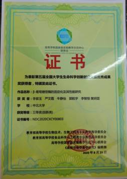 生物工程专业李紫玉、严文霞、牛静怡、郭航宇、李志恒、樊玥芸等六位同学凭作品“β-葡萄糖苷酶的固定化及其性能研究”在比赛中荣获创新类三等奖(创新类)指导老师史楠、王海宾。此次大赛获奖展现出我校学子良好的精神风貌,并将促进生物工程专业师生更多参与全国性赛事、开阔眼界,进一步提高教学积极性和专业自信心。