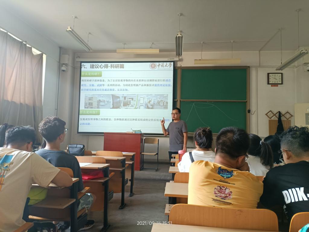 首先,吴老师通过人才层次分布图鼓舞学生,使大家充分的正视了自己的层次,并介绍了自己硕博期间的经历以及成果,鼓励研究生要明白自己的目标并为之付出不懈的努力。其次,告诉学生在求学期间,要勤奋好学,面对困难不屈不挠;同时与良师相遇是人生之幸,要常怀感恩之心;在面对同学时我们要真诚相待,虚心请教师兄师姐,善待师弟师妹,收获益友是人生最大的财富;告诫学生明白为什么要入党、是否了解中国共产党、我们党的使命是什么,要端正我们的入党动机。最后,吴老师在科研方面给大家介绍了什么是科研?什么是科技?我们作为研一新生如何培养自己的科研思维能力?要以某一点去研究某一面,更要通过这一面研究其中的某一点,研究生要有创新意识并学会如何创新。
