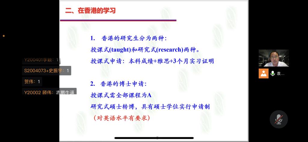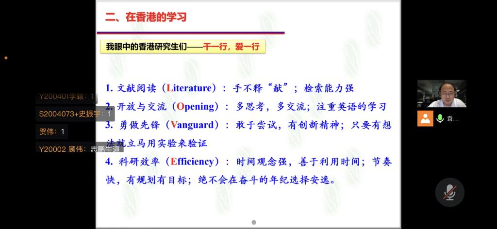 袁长春教授从香港生活与学习、香港研究生申请、香港研究生的培养过程及自己的科研感想等多方面,与同学们分享了这两年在香港做研究的一些体会和感想。袁老师从文献阅读丰富(Literature)、开放与交流(Opening)、勇做先锋(Vanguard)以及科研效率高(Efficiency)等方面,与同学们分享了香港特区大学学生的科研精神。此外,袁教授结合自身的工作以及访学经验,介绍了香港科研留学和研究生培养的相关注意事项。袁教授指出我们不论在哪里学习,都应该严格要求自己,抱有终身学习的态度。