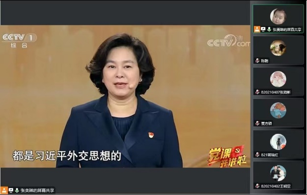 博士研究生党支部组织了“党课开讲啦”线上专栏学习活动,全体党员观看了由华春莹讲述的《学习贯彻习近平外交思想,塑造新时代大国外交风范》的主题党课。