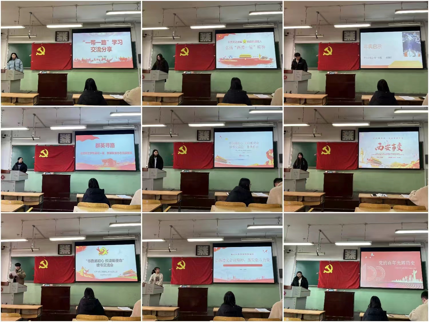 交流会伊始,领学人李佳宇同志介绍了本次活动的主题与意义,并对两本书籍进行了简要介绍,并带领与会人员共同学习和观看了中国共产党的奋斗历程;接着由读书代表们依次进行读书感受分享,通过共读、共学、共谈的方式,从每个重要时期具有重要历史意义及重大深刻影响的事件,以点入面,展现了近代以来中国发展过程中一幅幅波澜壮阔的历史画卷,从党的伟大奋斗历程中汲取继续前进的智慧和力量。主要讲述了“西安事变”、“遵义会议”、“非典启示”、“复兴之路”、“一带一路”、“两弹一星”和“党的百年光辉历史”,每位参与的同学都精心准备,以饱满的热情,详细解读,使大家对书中的每一个细节都有了更深的理解和感悟;最后,领学人对同学们的分享交流进行总结,为本次读书分享会画上圆满的句号。