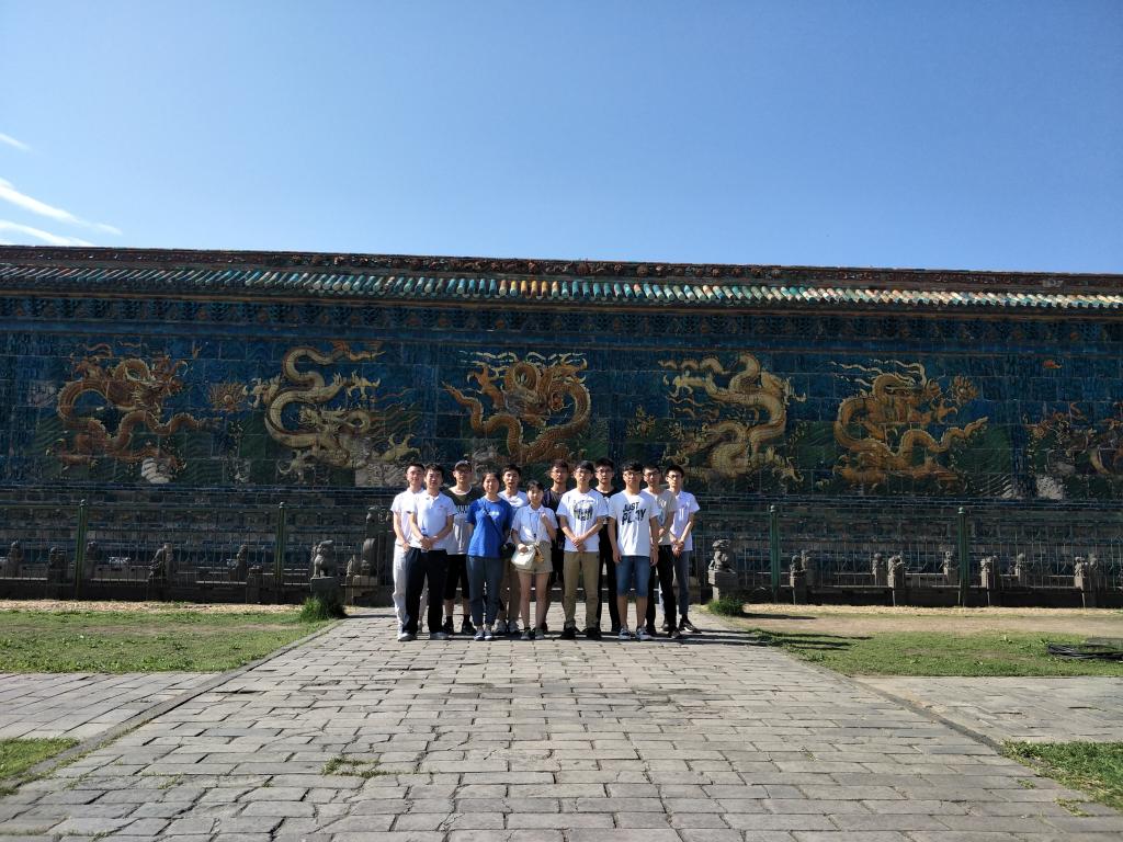 伴随着清晨的第一缕阳光,我们兴致勃勃的前往大同九龙壁。刚进入园门,我们所有人都被那庞大气势所震撼。它似乎并没有因为600年岁月而尽显沧桑,反而依旧宏伟,令人眼前一亮。临近九龙壁,先看到的是一处倒影池,龙被倒影在水中,随着水波,静态的龙就像是动了起来。令我遗憾的是,为保护九龙壁的完整性,中间的石桥并未让人通行,所以我们只能远观它的美丽,据已知资料,九龙壁壁高8米,厚2.02米,长45.5米。壁底为须弥座,高2.09米,敦实富丽,上雕41组二龙戏珠图案。腰部由75块琉璃砖组成浮雕,有牛、马、羊、狗、鹿、兔等多种动物形象,生动活泼,多彩多姿。每当朝阳升起,金光万道,九龙壁涂上了一层耀眼的光辉,巨龙仿佛冲破雾霭,腾身游动起来。随着晨雾的消散,九条龙更加绚丽,万缕金光在龙身上闪耀,龙身抖动,昂首摆尾,盘绕弯曲,在海波上翻腾,在流云中穿行,犹如真龙再现,宛然如生。我们站在它前面显得特别的渺小,我不禁佩服中国古代建筑师的匠心独运。最后随着我们在九龙壁下合影的完成,第六天的暑假实践也结束了。