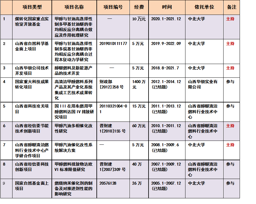 主持和参与承担国家及省部项目9项,获国家授权发明专利10项,其中5项应用于工业实践。发表学术论文20余篇,其中SCI论文8篇。参编《甲醇燃料》产业化实践录著作,主编《化工原理实验指导》教材,担任《工业催化理论及应用》研究生课程和《工业催化》本科生课程讲授。